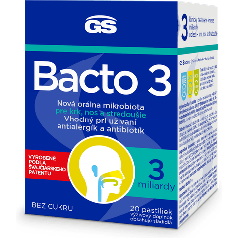 | | | GS Bacto 3, 20 pastiliek | | | | Výživový doplnok | | | GS Bacto 3 je nové orálne probiotikum s vitamínom D na podporu imunity slizníc hrdla, nosa a stredného ucha. Obsahuje 3 špeciálne probiotické kmene, 3 miliardy prospešných baktérií, ktoré kolonizujú… | | | | | | |